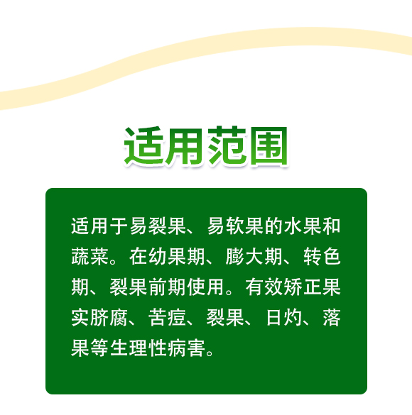 效果顯著:可有效補充作物所需的微量元素,提高自身免疫,促進果實膨大和著色,有效矯正果實臍腐、苦痘、裂果、日灼、落果等生理性病害。