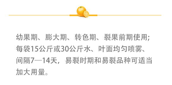 幼果期、膨大期、轉(zhuǎn)色期、裂果前期使用;每袋15公斤或30公斤水、葉面均勻噴霧、間隔7—14天,易裂時期和易裂品種可適當加大用量。